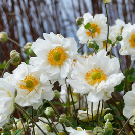 Zones 4-7 plant in spring Zones 8-11 plant in fall. It produces masses of double-deep pink or white cup-shaped flowers. Anemone hupehensis Frilly Knickers.